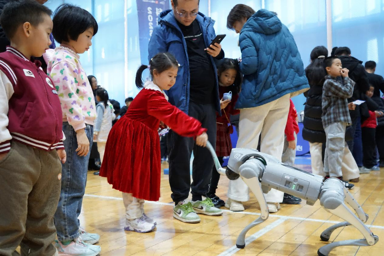 要說現(xiàn)場最受歡迎的環(huán)節(jié),當屬萌寵機器人的互動時刻!神秘嘉賓阿爾法機器狗一亮相,便憑借憨態(tài)可掬的模樣圈粉無數(shù)。它靈活地穿梭在人群中,與孩子們親密互動,時而點頭、時而打滾,可愛的表現(xiàn)引得現(xiàn)場歡聲笑語不斷。這溫馨的一幕,不僅拉近了科技與大眾的距離,更讓大家感受到了科技的溫度。原本冰冷的機械,在人性化的互動中變得溫暖可親,也讓孩子們對科技產生了更濃厚的興趣與好感。